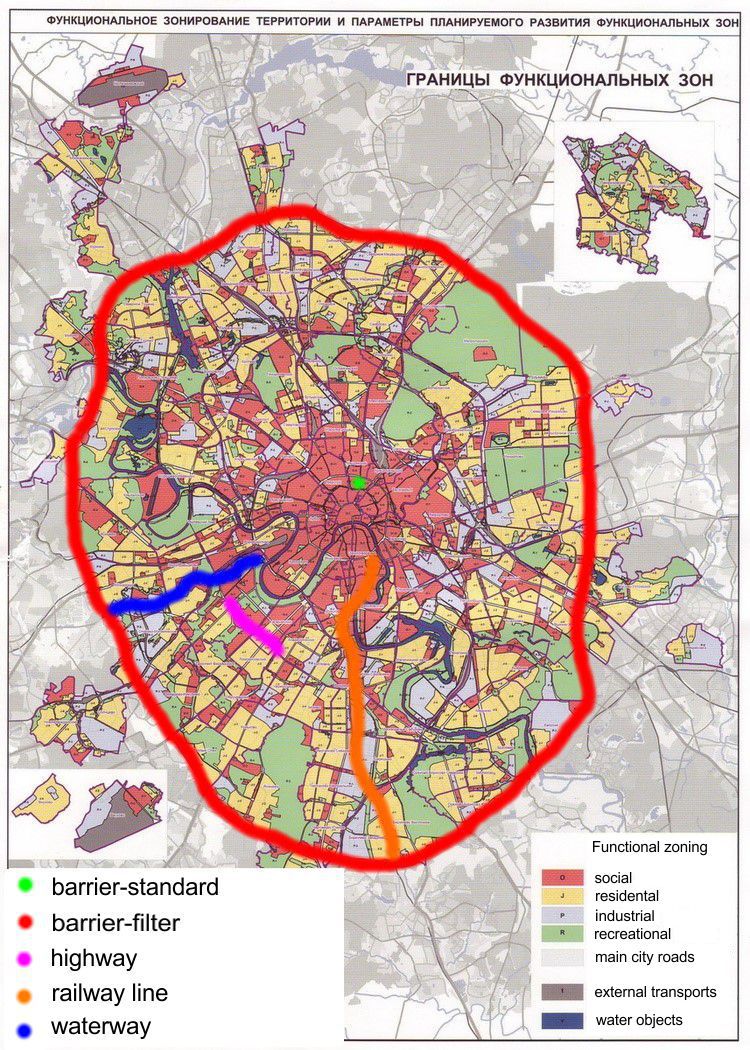 Статья посвящена анализу внутригородских границ-барьеров в Москве. Барьером в городской среде автор называет границу между городскими узловыми районами с высокой степенью барьерной функции. Такая граница – жесткая, четкая, квазилинейная – существует в течение продолжительного времени (десятилетия и более). Барьерность городской среды в терминологии автора – это степень дезинтеграции города на относительно слабо связанные районы, обладающие внутренней целостностью. Выделены три типа городских барьеров по генезису – автомобильные, железнодорожные, водные. Военные, лесные, индустриальные и частные огороженные территории (кондоминиумы и индивидуальные земельные участки) находятся вне рамок исследования ввиду того, что созданные ими барьеры не разделяют районы городов (социальные, экономические, политические и другие), а отделяют специфические территории от всей остальной городской среды (т.е. являются  самостоятельными районами). Для каждого города существуют барьеры с максимальной и минимальной проницаемостью границ. Под проницаемостью внутригородских границ в данном случае понимается возможность пересечения и степень пересеченности барьера. Городской барьер с максимальной проницаемостью предлагается называть барьером-эталоном. Городской барьер с минимальной проницаемостью – барьером-фильтром. Сравнение барьера-эталона и барьера-фильтра позволяет оценить размах территориальных различий внутри города. Сравнение барьеров разного типа с барьером-эталоном и барьером-фильтром позволяет оценить характерную проницаемость барьеров на фоне максимальных и минимальных значений.