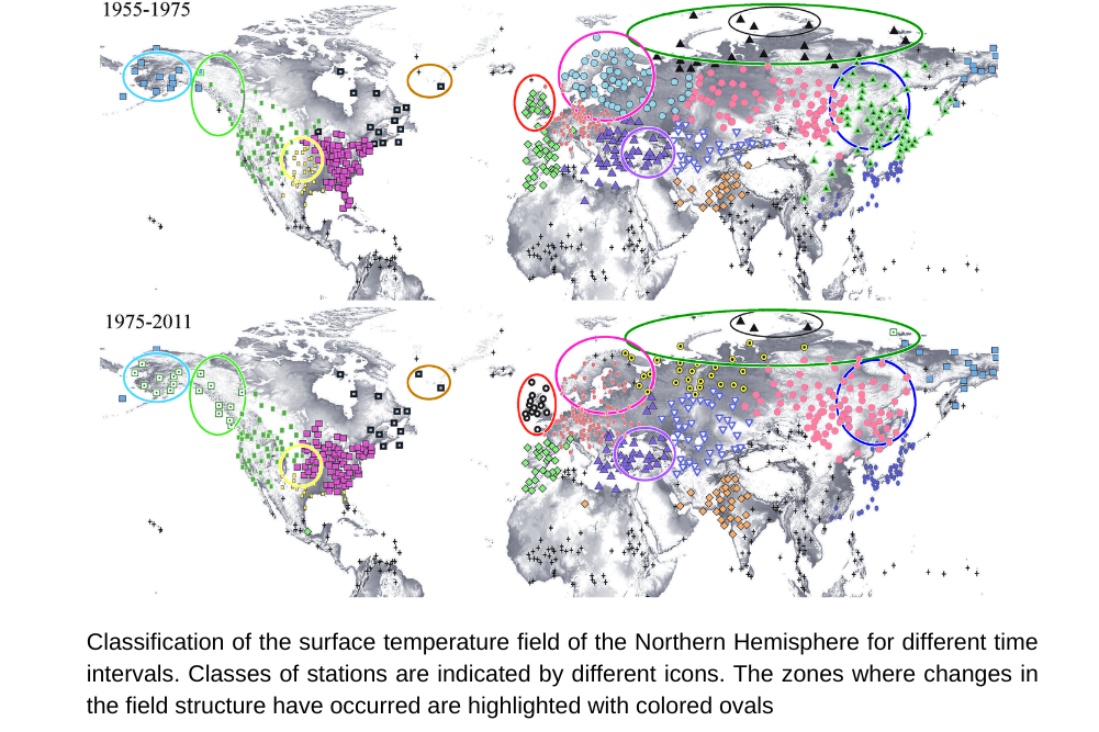 Выбор информативных критериев и объективных методов классификации остается актуальной задачей климатологии. Исследуются изменения температуры по данным 818 станций Северного полушария за 1955–2011 гг. Приведены результаты климатической кластеризации для разных временных периодов, соответствующих основным тенденциям изменения глобальной температуры, на основе алгоритма, использующего для классификации согласованность изменений фазы колебаний приземной температуры. Степень согласованности оценивалась коэффициентом корреляции между фазами исходных температурных рядов. Выявлено, что на фоне роста глобальной температуры происходит перестройка в структуре согласованности температурных колебаний, наблюдается переход многих станций более северных классов в более южные. Районами Северного полушария, где метеостанции изменили свою структурную принадлежность в разные периоды, что может служить показателем чувствительности к глобальным климатическим трендам, являются территории Фенноскандии, Британских островов, Центральноевропейской географической области и Среднеевропейской равнины, Гренландии, Российской горно-островной Арктики и Субарктики, п-ва Флорида, а также станции, расположенные в районах горного рельефа Евразии и в зонах влияния основных центров действия атмосферы.