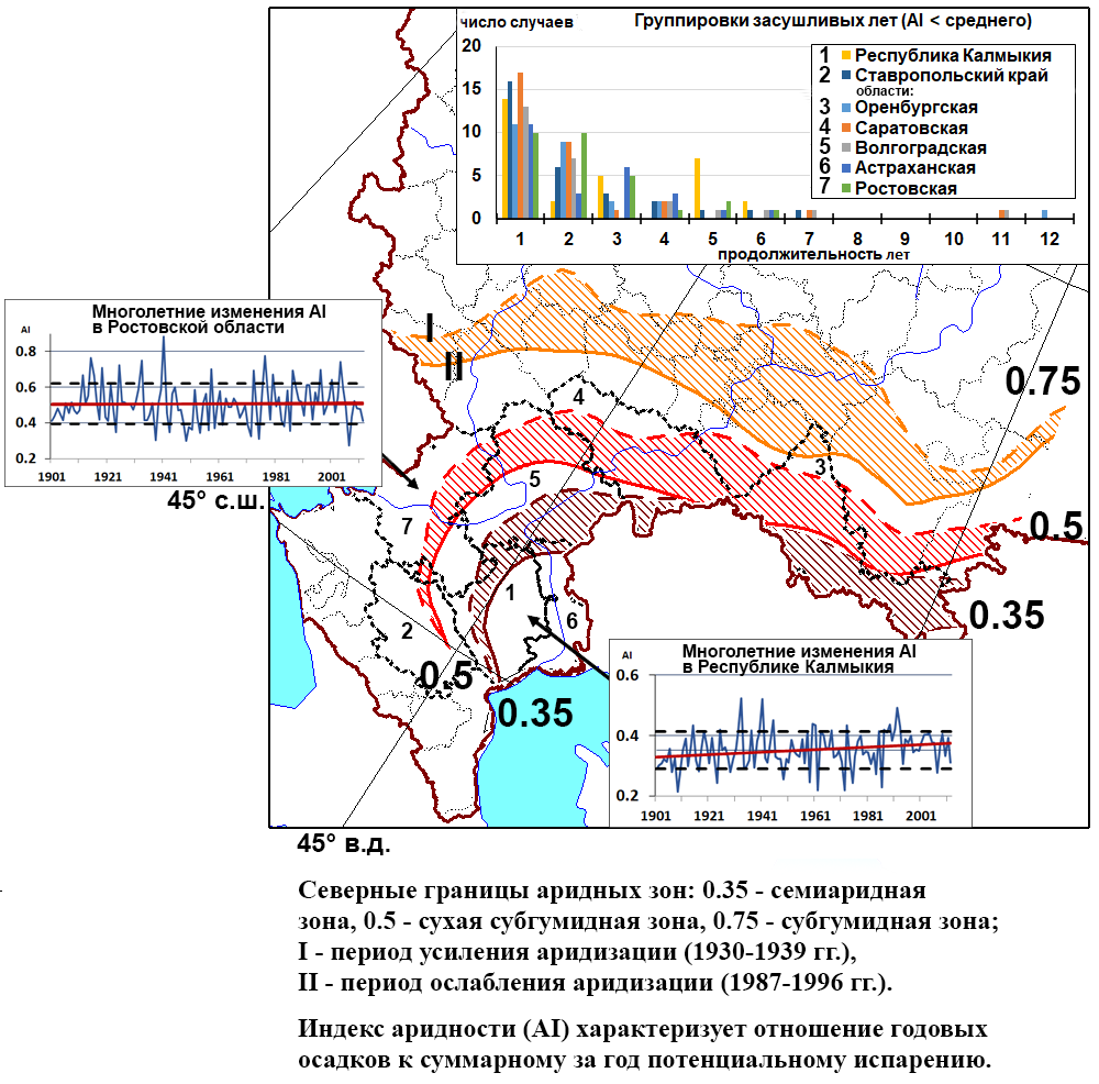 - Наиболее продолжительное усиление аридизации отмечалось в Оренбургской (12 лет), Саратовской и Волгоградской областях (11 лет). Менее продолжительные группировки засух (4–6 лет) были характерны для Республики Калмыкия, Волгоградской, Астраханской и Ростовской областей, а также Ставропольского края.