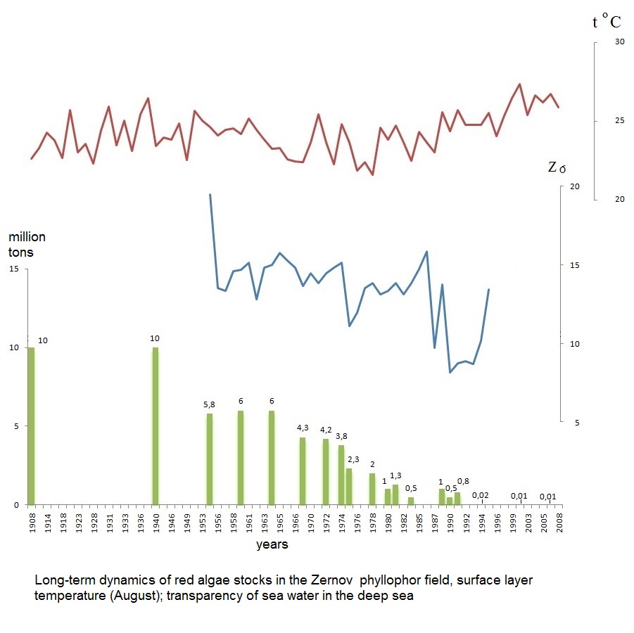 1. Long-term dynamics of red algae stocks in the Zernov Phyllophora field; sea surface temperature (August); transparency of sea water in the deep sea | |
