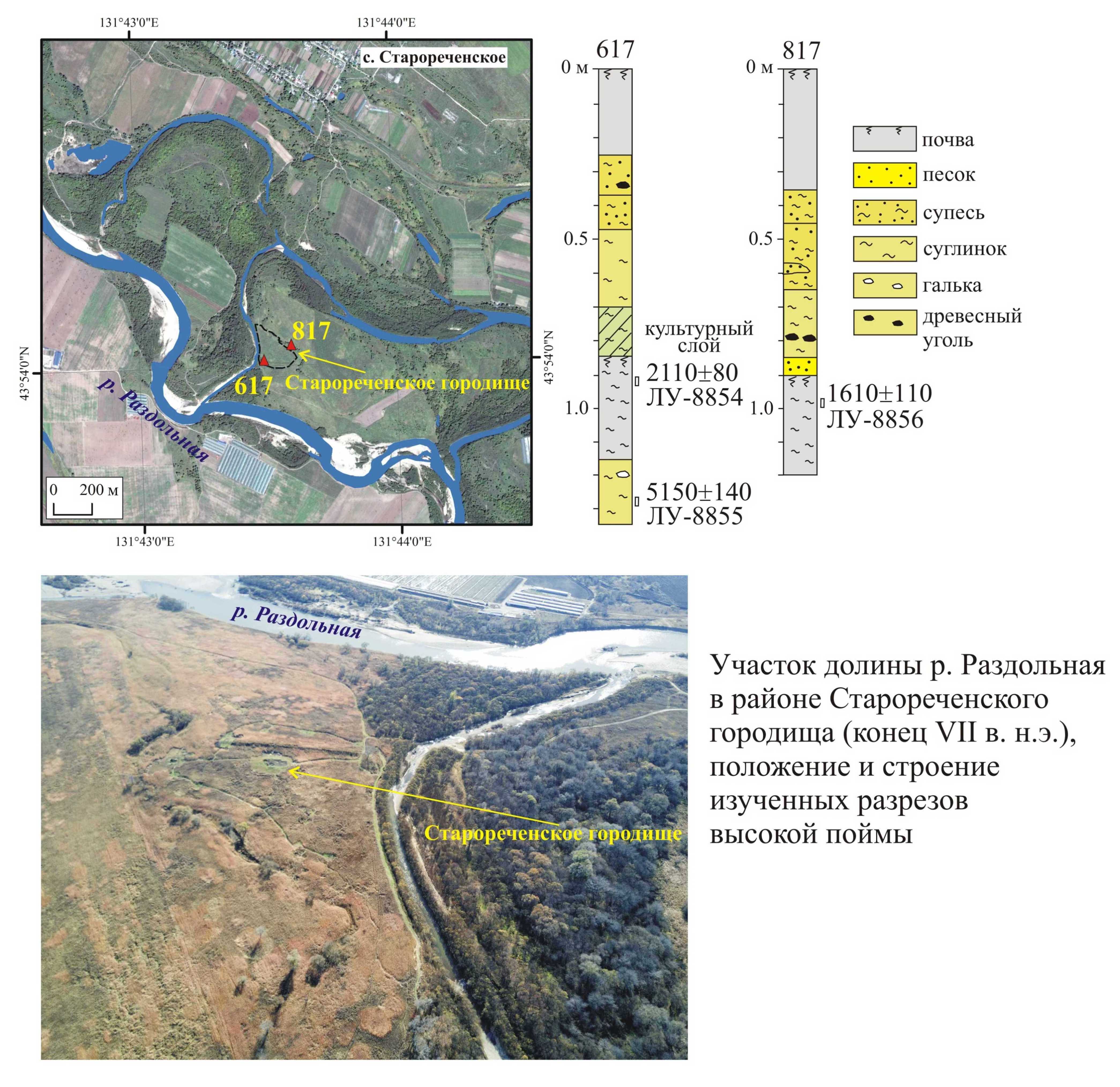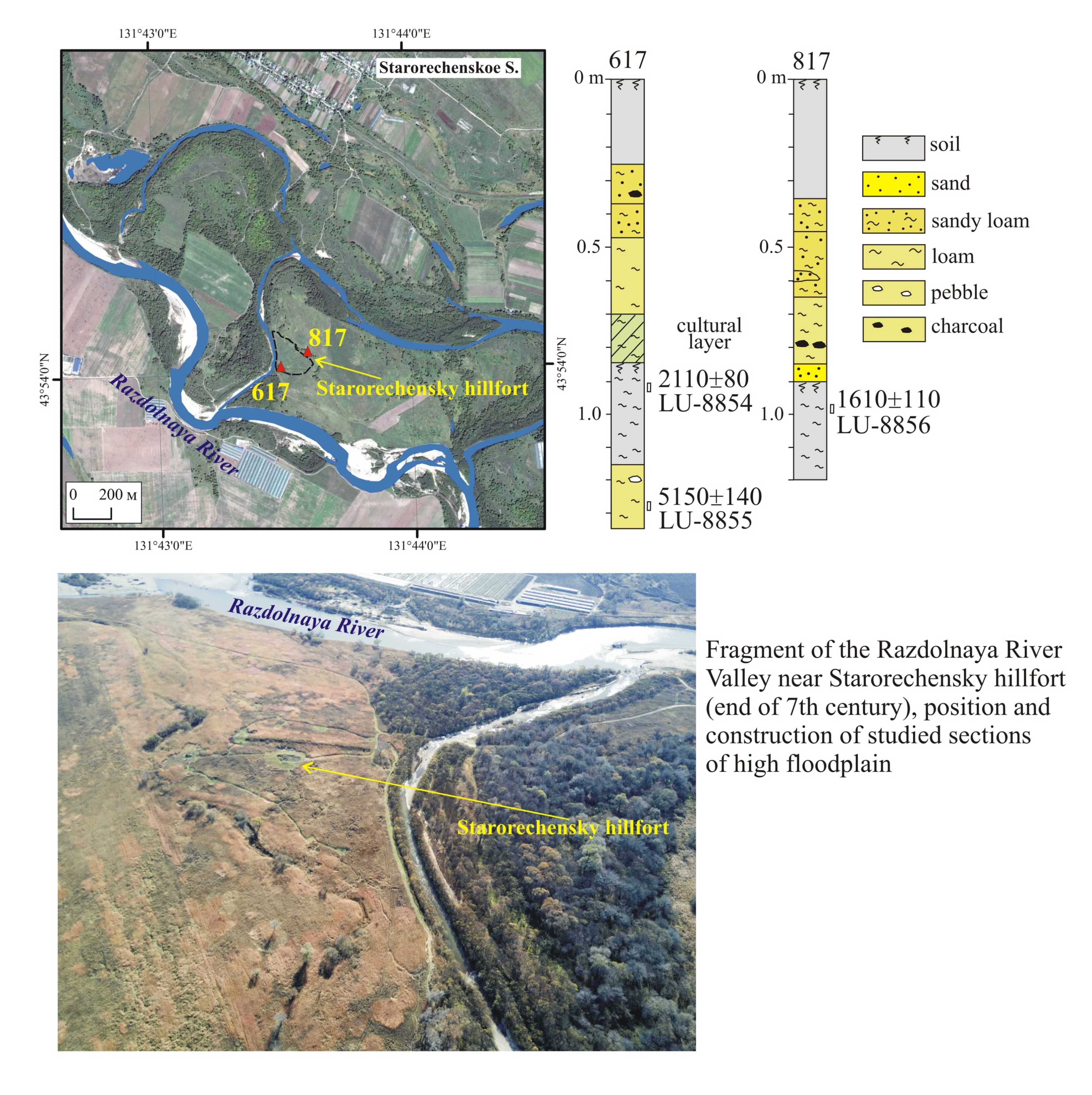 2. Fragment of the Razdolnaya River Valley near Starorechensky hillfort, position and construction of studied sections of high floodplain