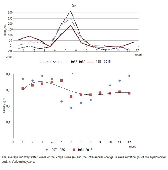 2. The average monthly water levels of the Volga River and the intra-annual change in mineralization of the hydrological post, v. Verkhnelebyazhye
