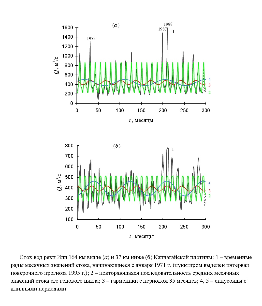 Анализ колебаний во временных рядах месячных значений стока р. Или за 1971—1994 гг. методом “Периодичностей” в створах, расположенных 164 км выше и 37 км ниже Капчагайской ГЭС, выявил по девять гармоник с длинами периодов более 1.5 лет. Установленные синусоиды вместе с повторяющимися последовательностями средних месячных значений стока в годовом цикле использованы в различных схемах прогнозирования стока по месяцам и в целом на 1995 г. Результаты поверочных прогнозов оценивались на новом независимом материале. Регулирование стока водохранилищем приводит к некоторому снижению его среднего значения, сглаживанию и нарушению ритмичности годового цикла. Многолетние периоды отчетливее проявляются в колебаниях стока ниже плотины. Несмотря на воздействие ГЭС, среди прочих синусоид в обоих рядах оказались выявлены гармоники с одинаковыми периодами длиной соответственно 25 и 35 месяцев. Возможно, они достовернее и их целесообразнее применять для оценок будущего стока по сравнению с синусоидами, периоды которых установлены только в одном из рядов. Сток р. Или в 1995 г. выше Капчагайской ГЭС был экстремально низким, а ниже — близким к среднему значению временного ряда. По многим использованным методикам прогнозов их результаты для стока выше плотины оказались лучше его оценок на будущее по среднему значению временного ряда, а ниже плотины фактическая ошибка прогнозирования была меньше допустимой. Поэтому прогнозы по ним по месяцам и на год в целом могут быть оценены как не хуже, чем удовлетворительные и приемлемые.