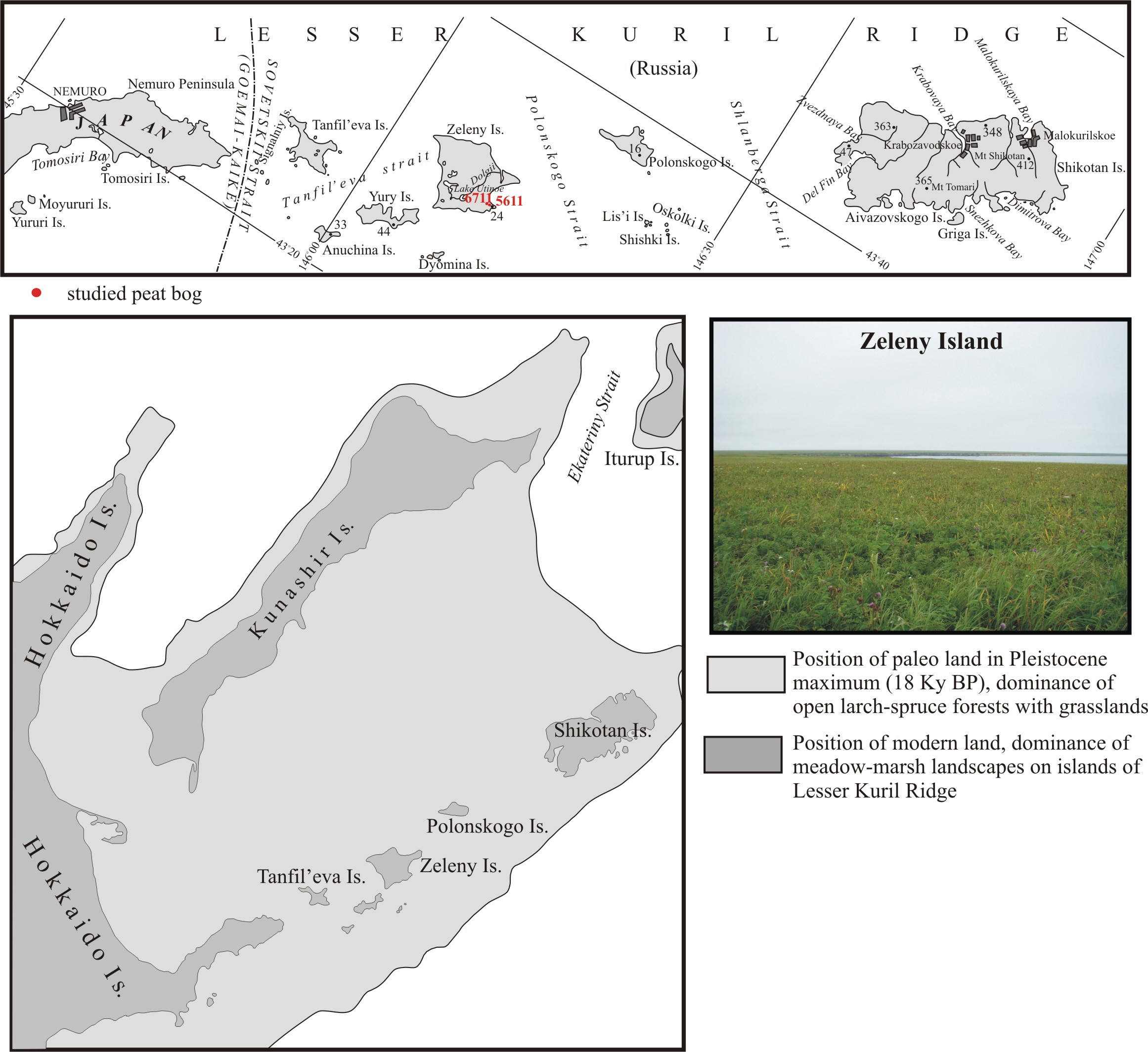 На основе комплексного изучения разреза торфяника на побережье бух. Рудня (о. Зеленый) восстановлены этапы развития ландшафтов на юге Малой Курильской гряды с конца позднего плейстоцена, когда существовал обширный сухопутный мост, соединявший Южные Курилы и о. Хоккайдо. В максимальную фазу трансгрессии в среднем голоцене окончательно завершился распад сухопутного моста, что привело к изоляции флоры и фауны островов. Особенности рельефа Малой Курильской гряды и увеличение океаничности климата затруднили заселение видов с прилегающих территорий. Древесная растительность достаточно быстро деградировала, преобладающими стали лугово-болотные ландшафты. К другим факторам, оказавшим влияние на последующее развитие биотических компонентов, относятся климатические флуктуации, тектоническое погружение, способствовавшее повышению уровня грунтовых вод, прохождение волн цунами, усиление роли холодного течения Оясио и выпадение вулканического пепла влк. Масю. Изменения ландшафтов Малых Курильских островов во многом сходны с таковыми на полуострове Немуро (Восточное Хоккайдо).