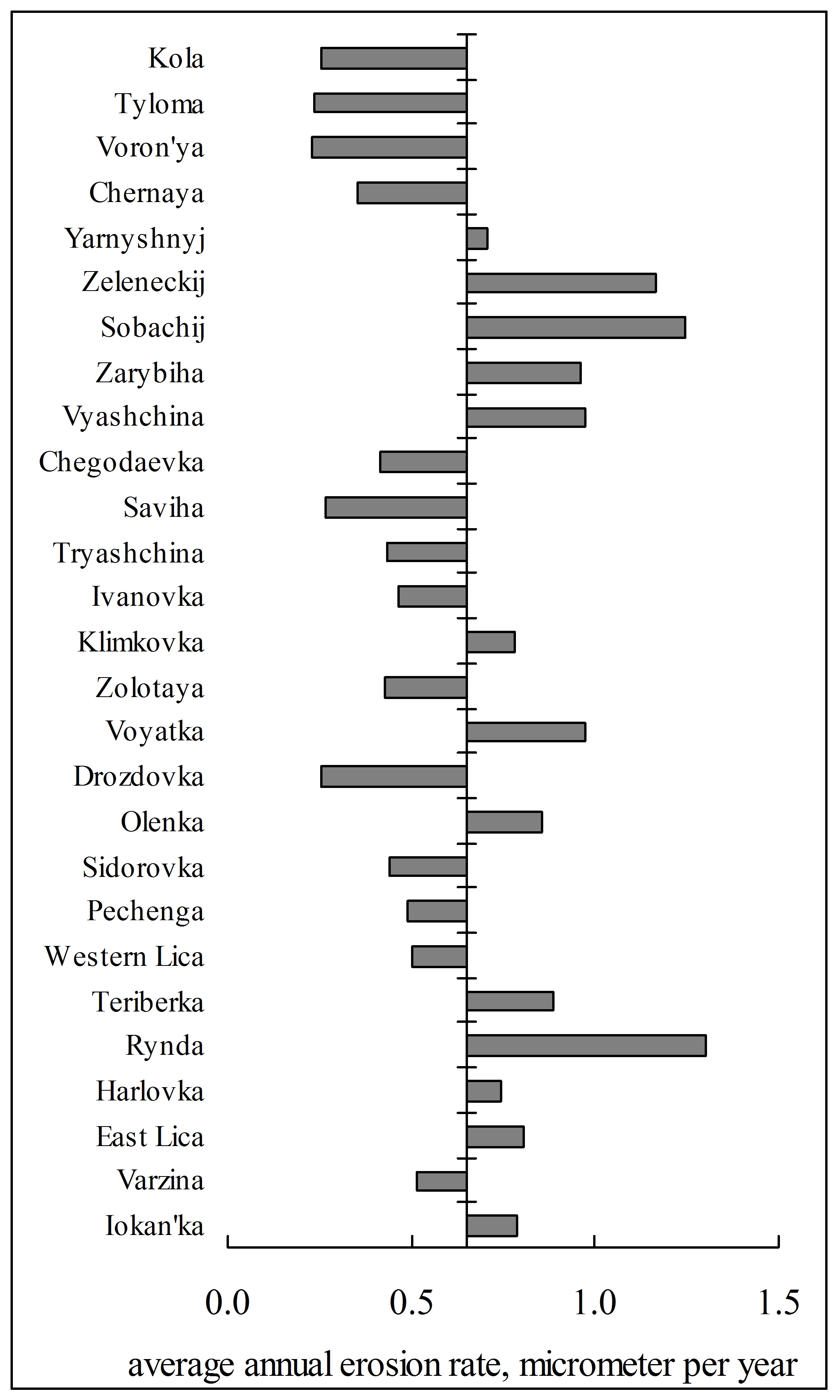 • Скорость эрозии водосборов Мурманского побережья не превышает 2 мкм в год.