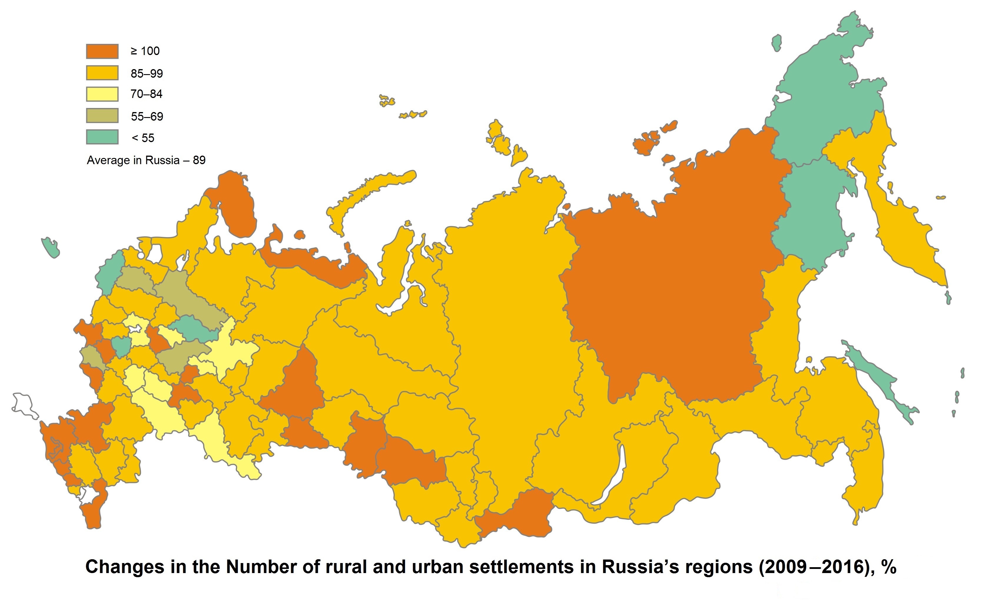 1. Изменение числа сельских и городских поселений в регионах России за 2009–2016 гг., % | |