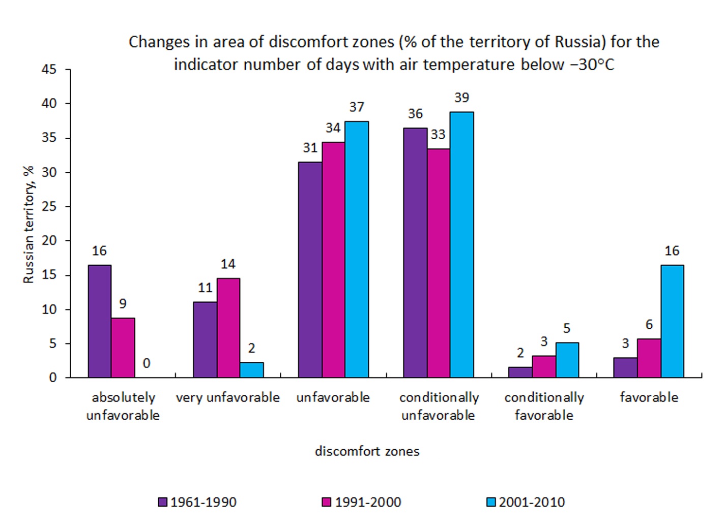 - Области с абсолютно неблагоприятными условиями по этому параметру (на севере Якутии) исчезают в начале XXI в.