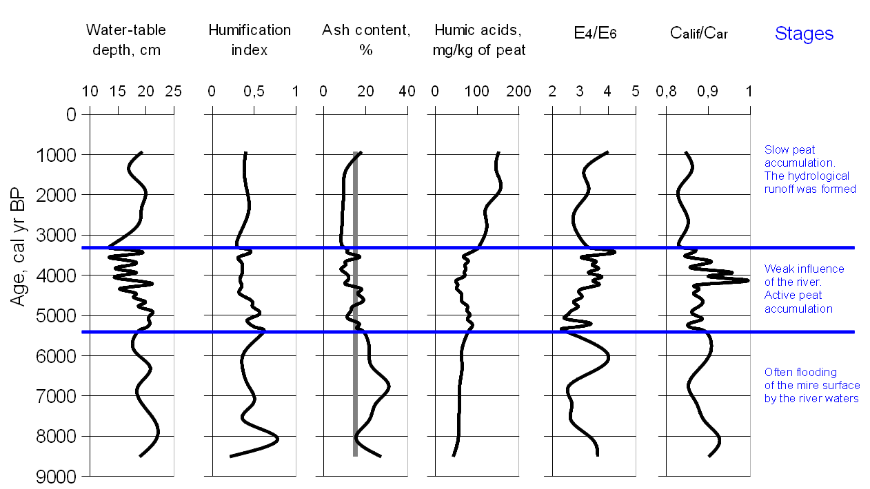 Проведено палеоэкологическое исследование торфяной залежи низинного террасного болота на юге таежной зоны Западной Сибири. Работа основана на комплексном подходе, в котором использован ряд методов: радиоуглеродное датирование, анализ ботанического состава торфа, раковинных амеб, степени гумификации и физико-химических свойств гуминовых кислот, извлеченных из торфа. Сопоставление результатов этих методов позволило воссоздать сложную историю развития низинного болота, определяемую локальными гидрологическими, геоморфологическими и геохимическими условиями на фоне происходивших климатических изменений. В начале развития болото подвергалось частым подтоплениям со стороны реки, что обеспечивало дополнительный привнос минеральных веществ и, как следствие, формирование торфов с высокой зольностью. Затем влияние реки ослабло, и рост торфяной залежи в большей мере определялся факторами эндогенного болотообразования и уровнем поверхностного гидрологического стока. Это привело к формированию нормальнозольных торфов; гигрофитные травы сменились осоково-гипновыми группировками. Выявлена высокая чувствительность болота к вариациям климата в течение последних 8500лет, что подтверждается синхронными колебаниями уровня обводненности на других болотах исследуемой территории.