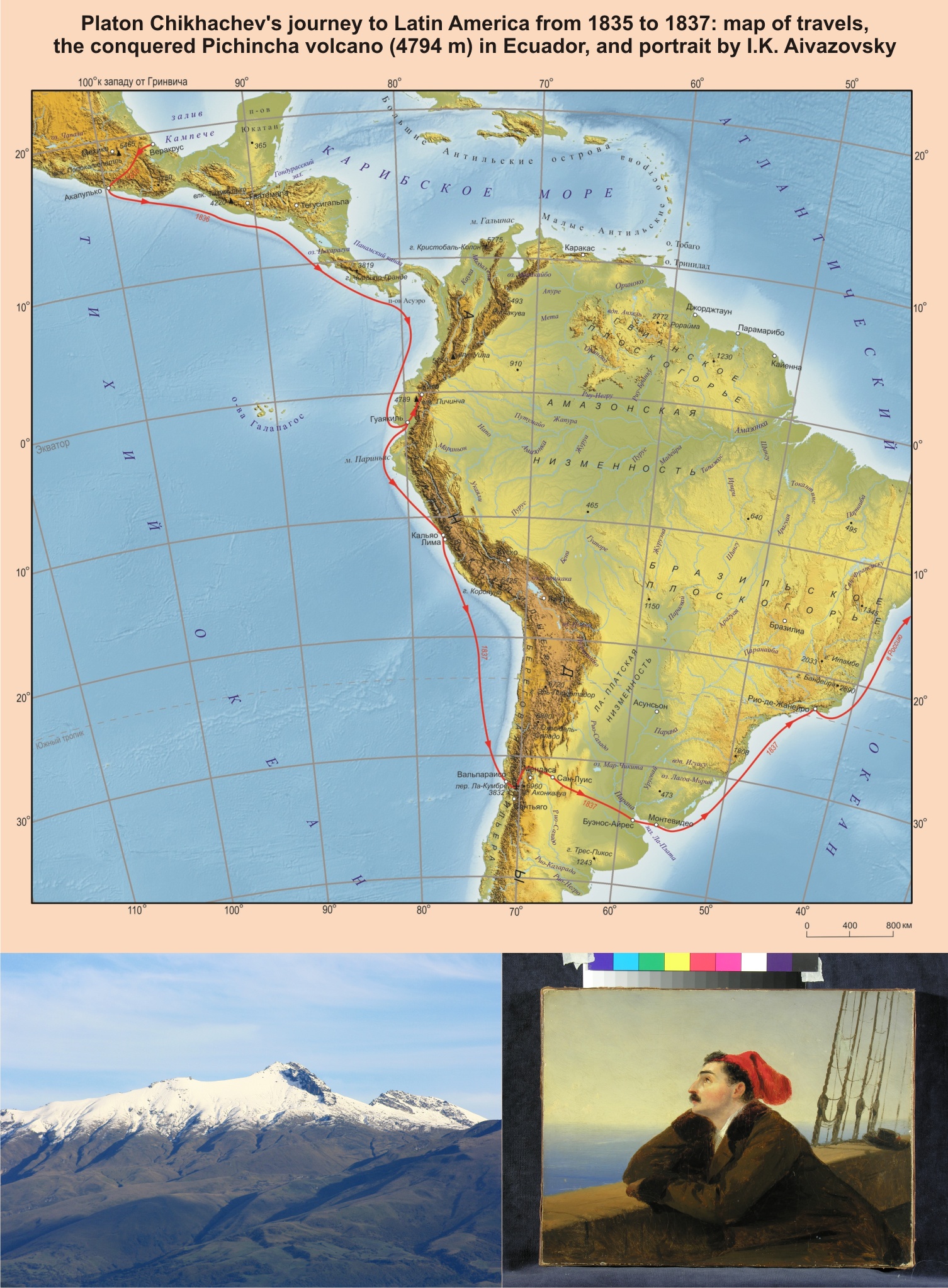 1. Путешествие Платона Чихачёва в Латинской Америке в 1935–1837 гг.: карта маршрутов, покорённый вулкан Пичинча (4794 м) в Эквадоре и портрет работы И.К. Айвазовского | |