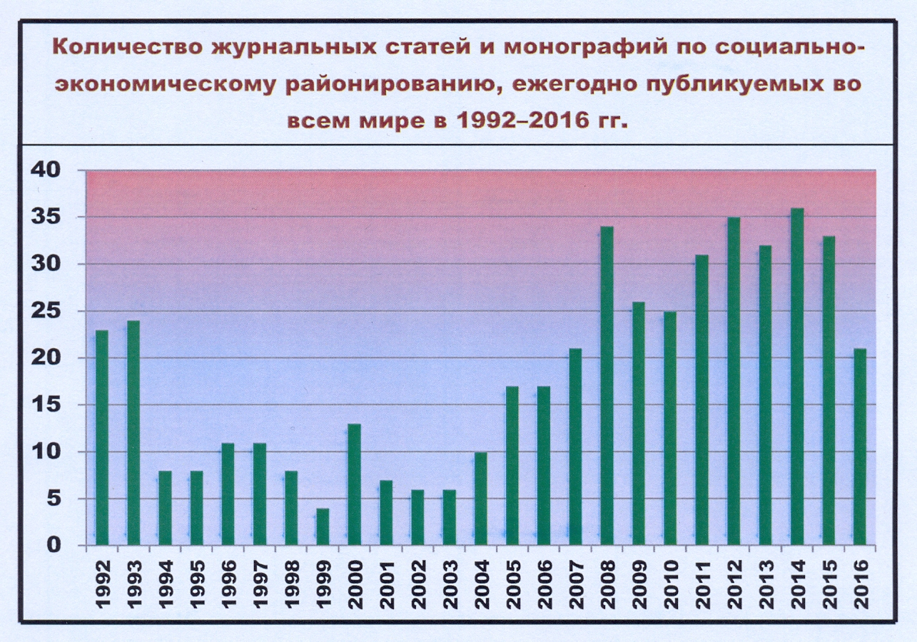 1. Количество журнальных статей и монографий по социально-экономическому районированию, ежегодно публикуемых во всем мире в 1992–2016 гг. | |