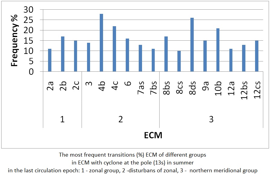 1. The most frequent transitions (%) ECM of different groups in ECM with cyclone at the pole (13s) in summer in the last circulation epoch: 1 – zonal group, 2 – disturbans of zonal, 3 – northern meridional group | |