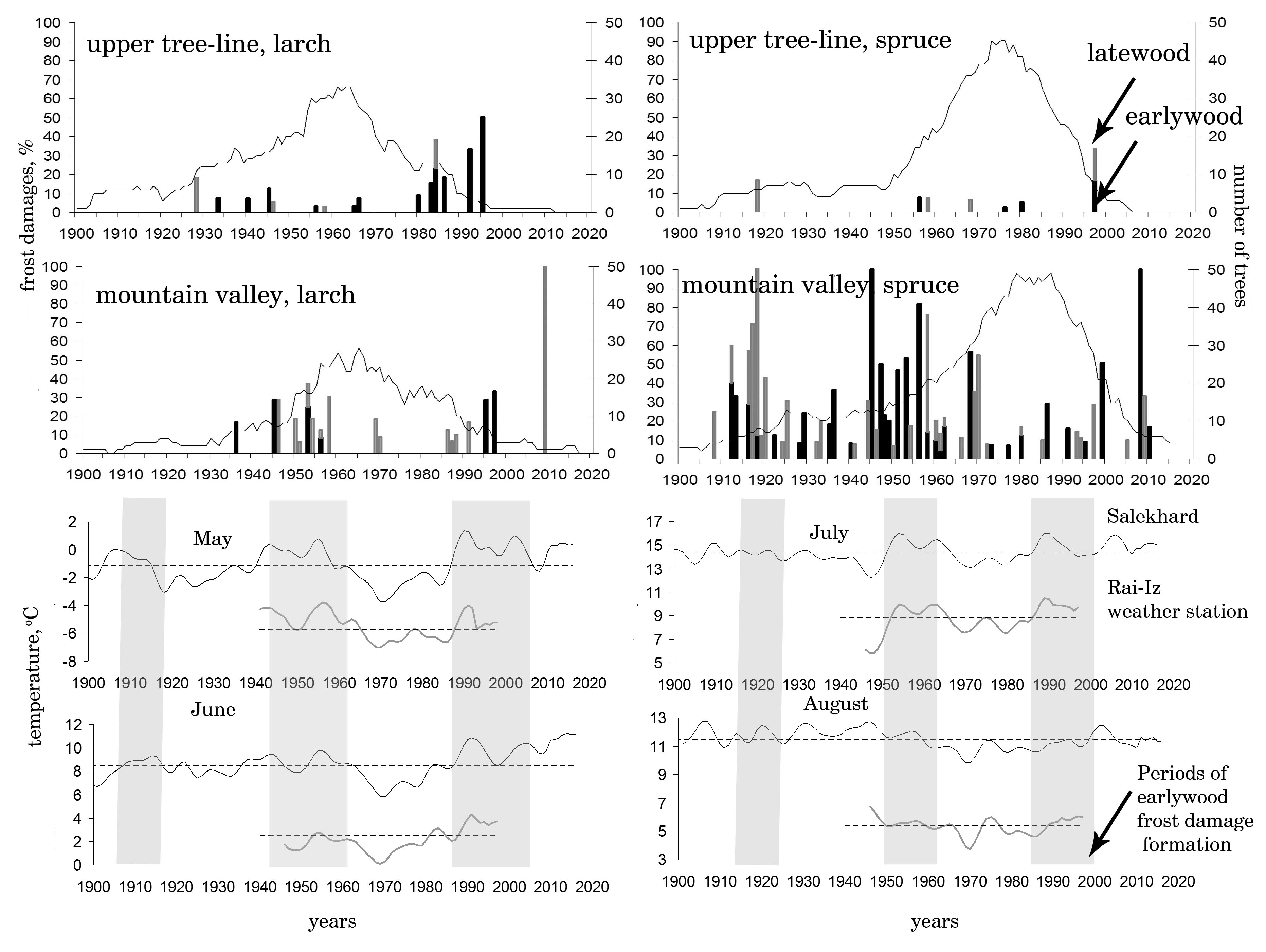 В горах Полярного Урала изучены частота повторяемости, интенсивность и пространственно-временное распределение морозобойных повреждений у ели и лиственницы, произрастающих в пределах одного склона юго-западной экспозиции на верхней границе распространения деревьев и на дне горной долины, с целью выявить пространственно-временную динамику их формирования в различные климатические периоды за последние 100 лет. На верхней границе леса повреждения формируются чаще у лиственницы по сравнению с елью, а на дне горной долины у лиственницы, напротив, повреждения формируются в два-три раза реже, чем у ели в одни и те же климатические периоды. Высокая частота формирования повреждений в ранней древесине хвойных приурочена к теплым климатическим периодам с ранним началом вегетации и небольшой высотой снега в мае. Выявлены наиболее экстремальные годы, когда повреждается большое количество деревьев, показано отличие от местообитаний, расположенных в Западной Сибири. Существует повышенный риск повреждений хвойных деревьев поздними весенними заморозками в связи с недавними изменениями климата на Полярном Урале.