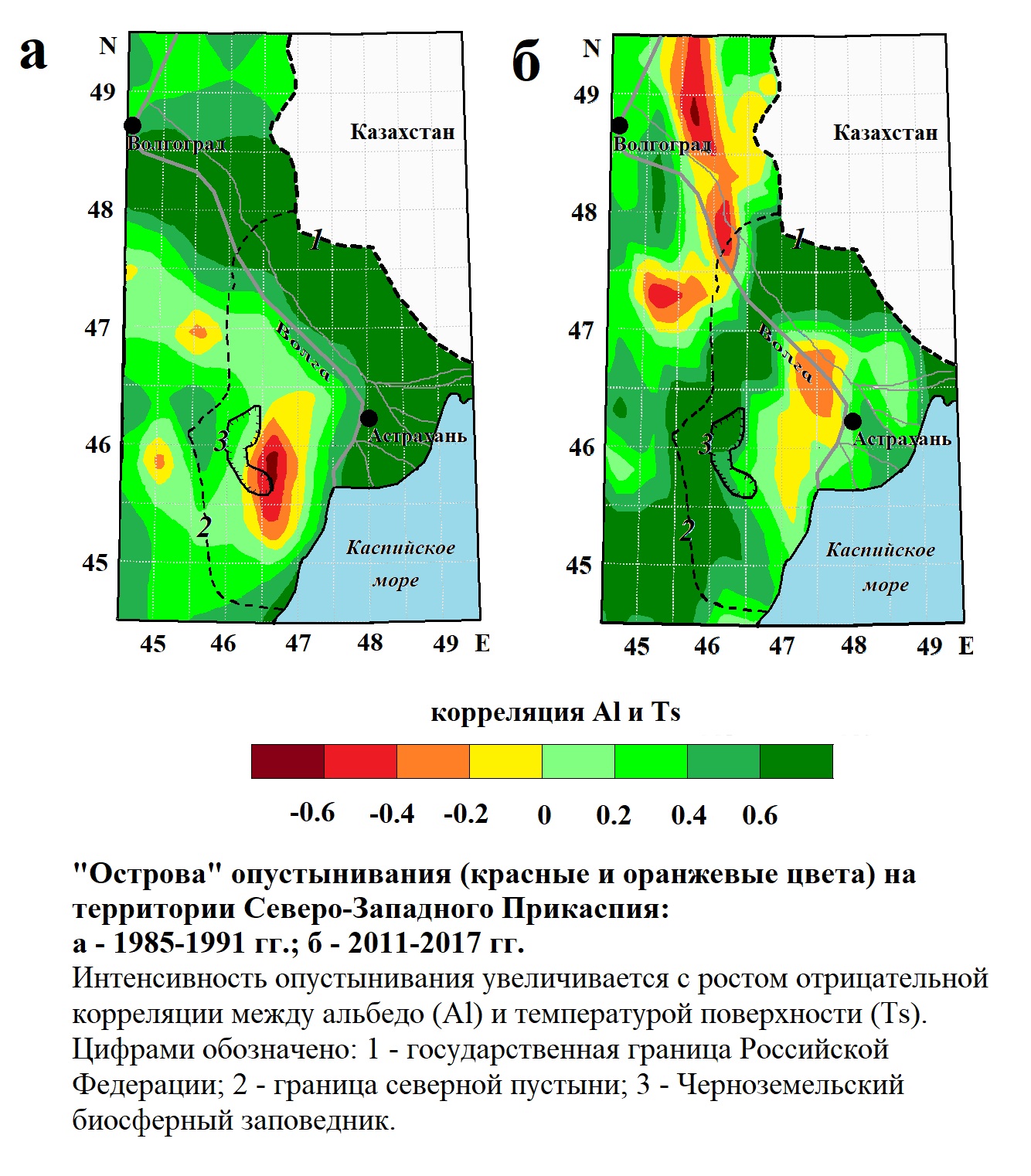 1. «Острова» опустынивания на территории Северо-Западного Прикаспия: а — 1985–1991 гг.; б — 2011–2017 гг. | |