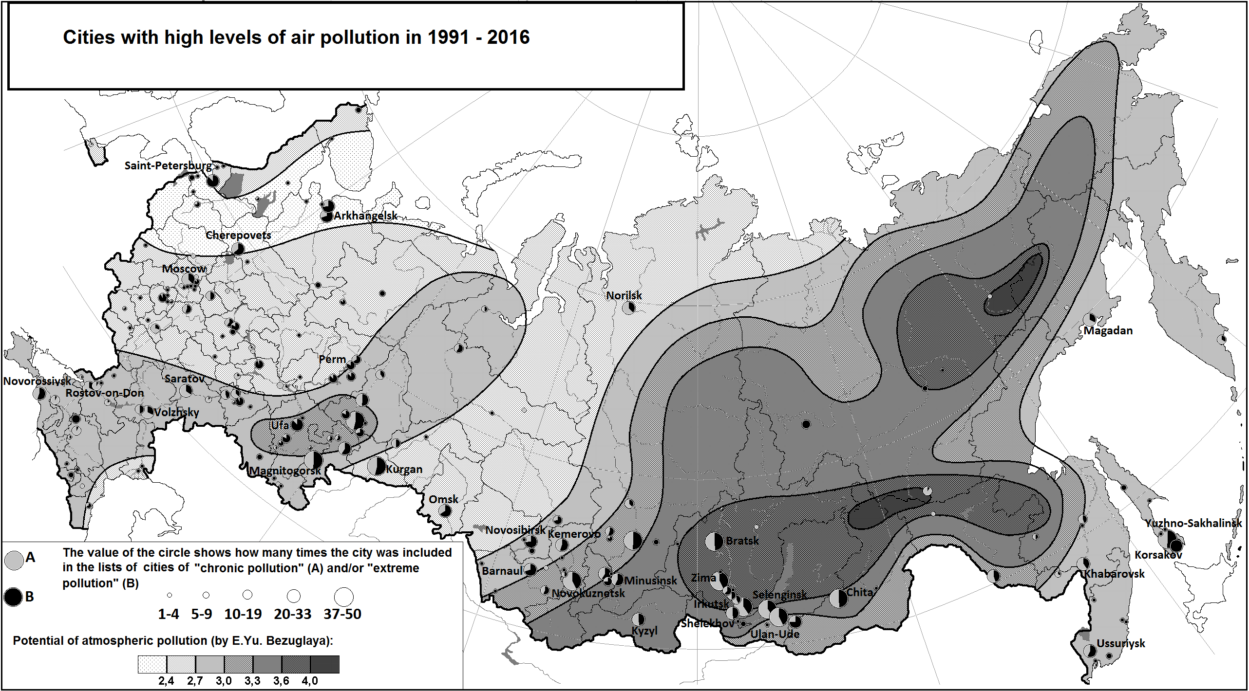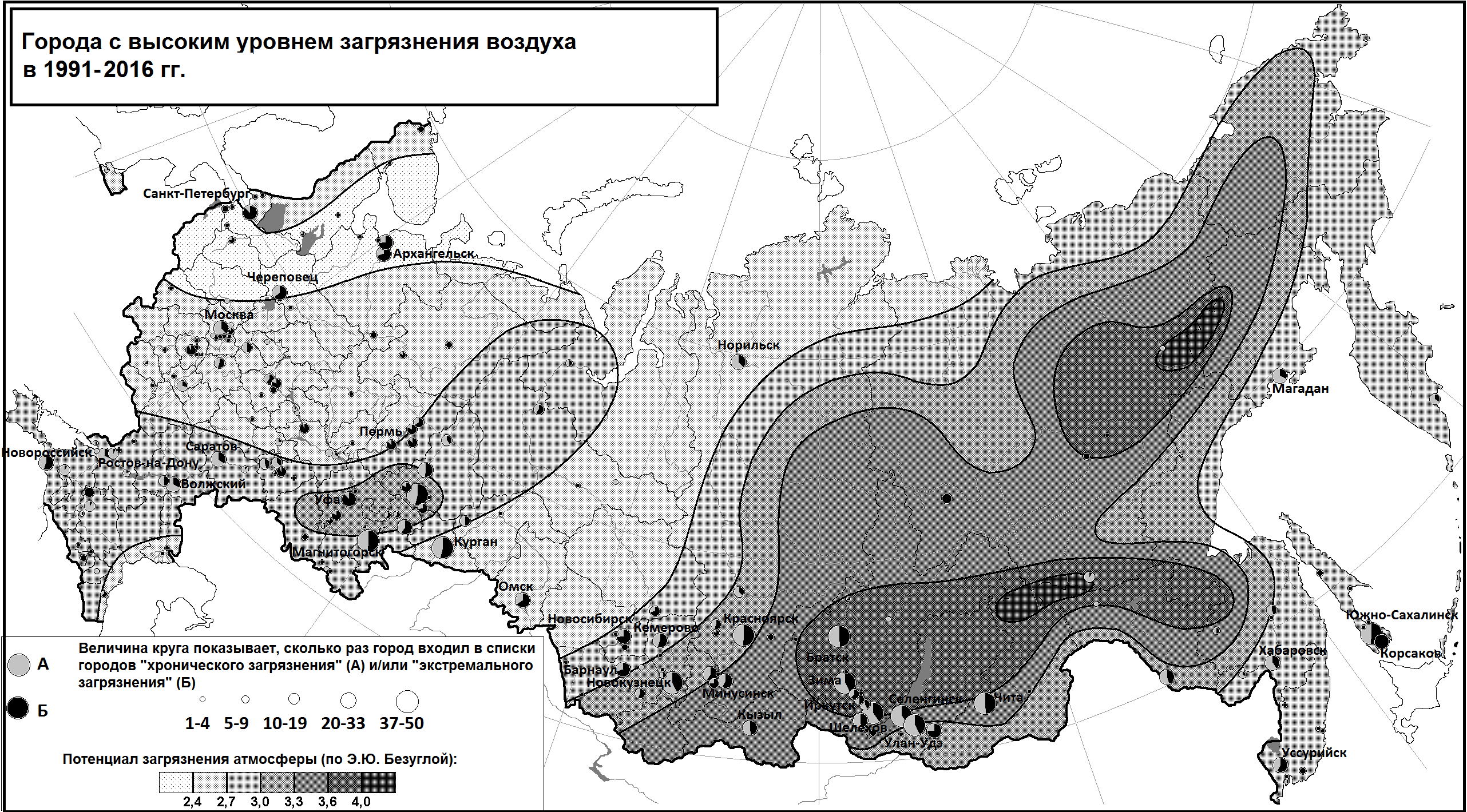 Проведен анализ качества атмосферного воздуха в городах России за 1991—2016 гг. Четыре города (Братск, Магнитогорск, Чита и Южно-Сахалинск) за этот период практически ежегодно попадали в “черные списки” Росгидромета — как хронически, так и экстремально загрязненных городов. Высоким уровнем загрязнения атмосферы выделяются города Иркутской области, Красноярского края, а также Свердловской и Челябинской областей. Выявлены ведущие факторы формирования экологической обстановки в городах в зависимости от их локализации, специализации и людности: 1) крупные выбросы промышленности и/или транспорта; 2) выбросы преимущественно неидентифицированных источников загрязнения; 3) высокий естественный потенциал загрязнения атмосферы; 4) “импорт” загрязнений от внешних источников из-за неблагоприятного экологогеографического положения. Кардинальное решение проблемы грязного воздуха видится только на основе регулирования территориального развития России.