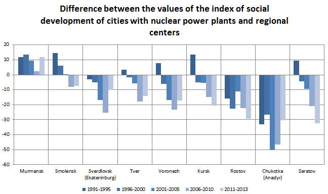 1. Разница между значениями индекса социального развития городов АЭС и региональных центров | |
