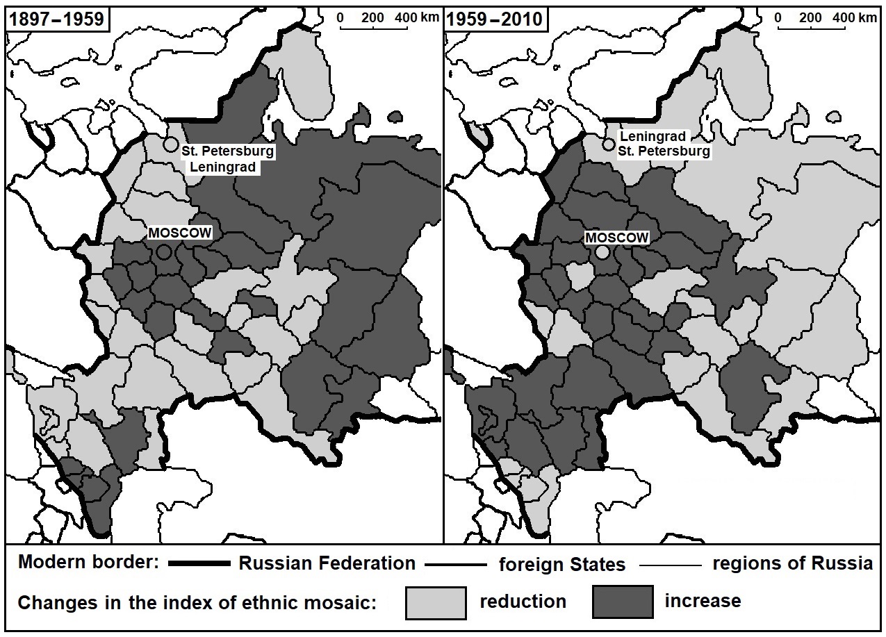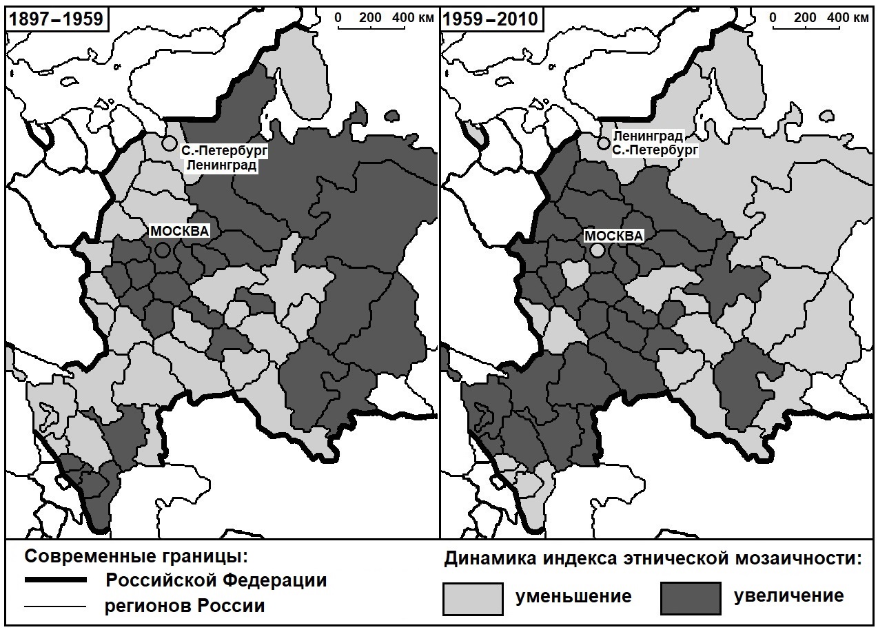 Оценка изменения этнической мозаичности регионов Европейской России в периоды между переписями 1897, 1959 и 2010 гг.
