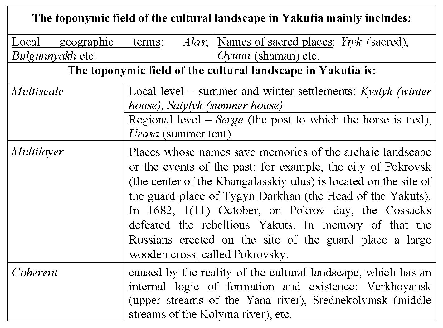 - Особенность «топонимического поля» культурного ландшафта Якутии — преобладание народных географических терминов и сакральных топонимов, неразрывно связанных с живой традиционной культурой.
