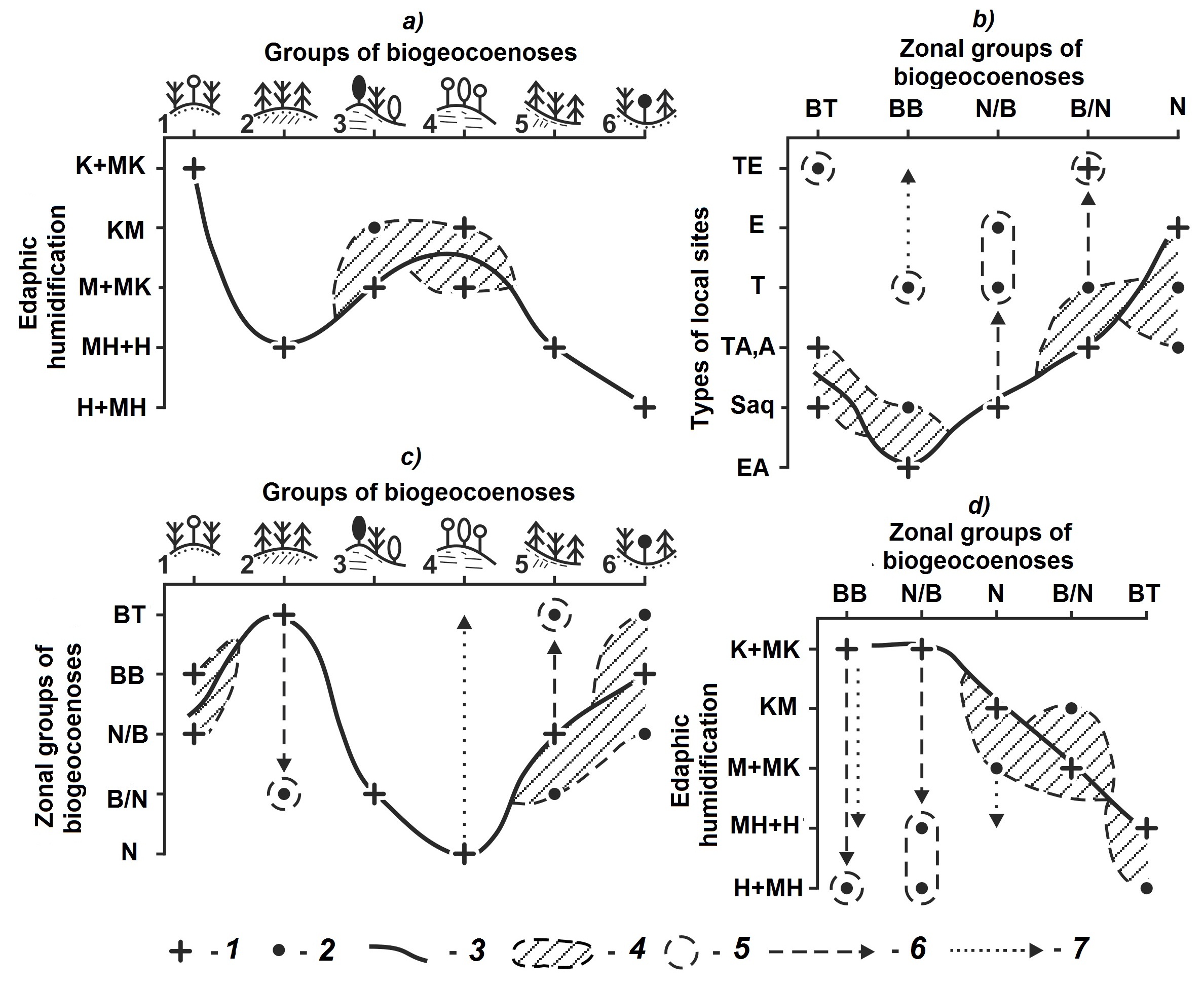 1. Ordination of groups of biogeocoenoses and their zonal groups by types of local sites and edaphic humidification | |
