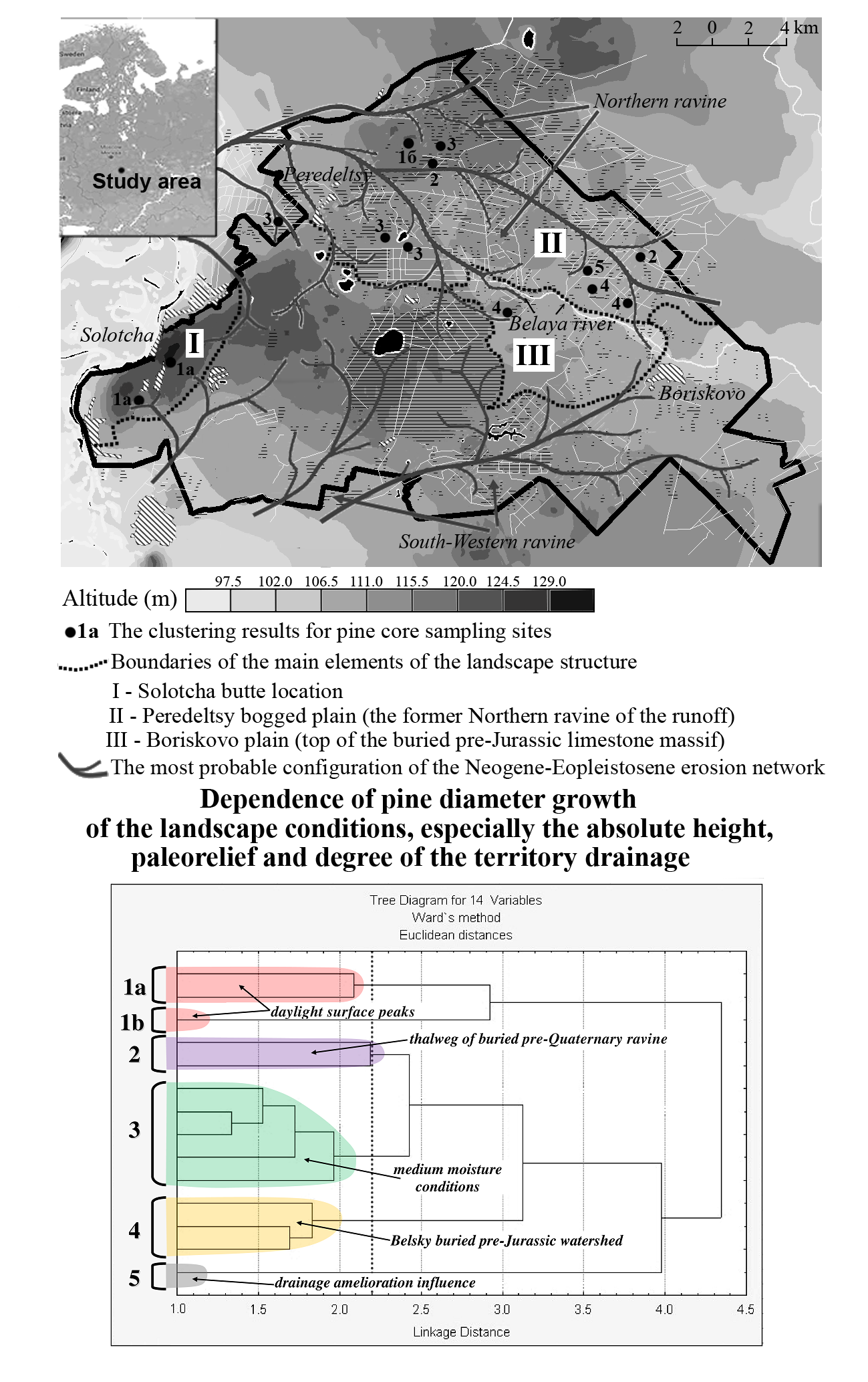 1. Dependence of pine diameter growth of the landscape conditions, especially the absolute height, paleorelief and degree of the territory drainage