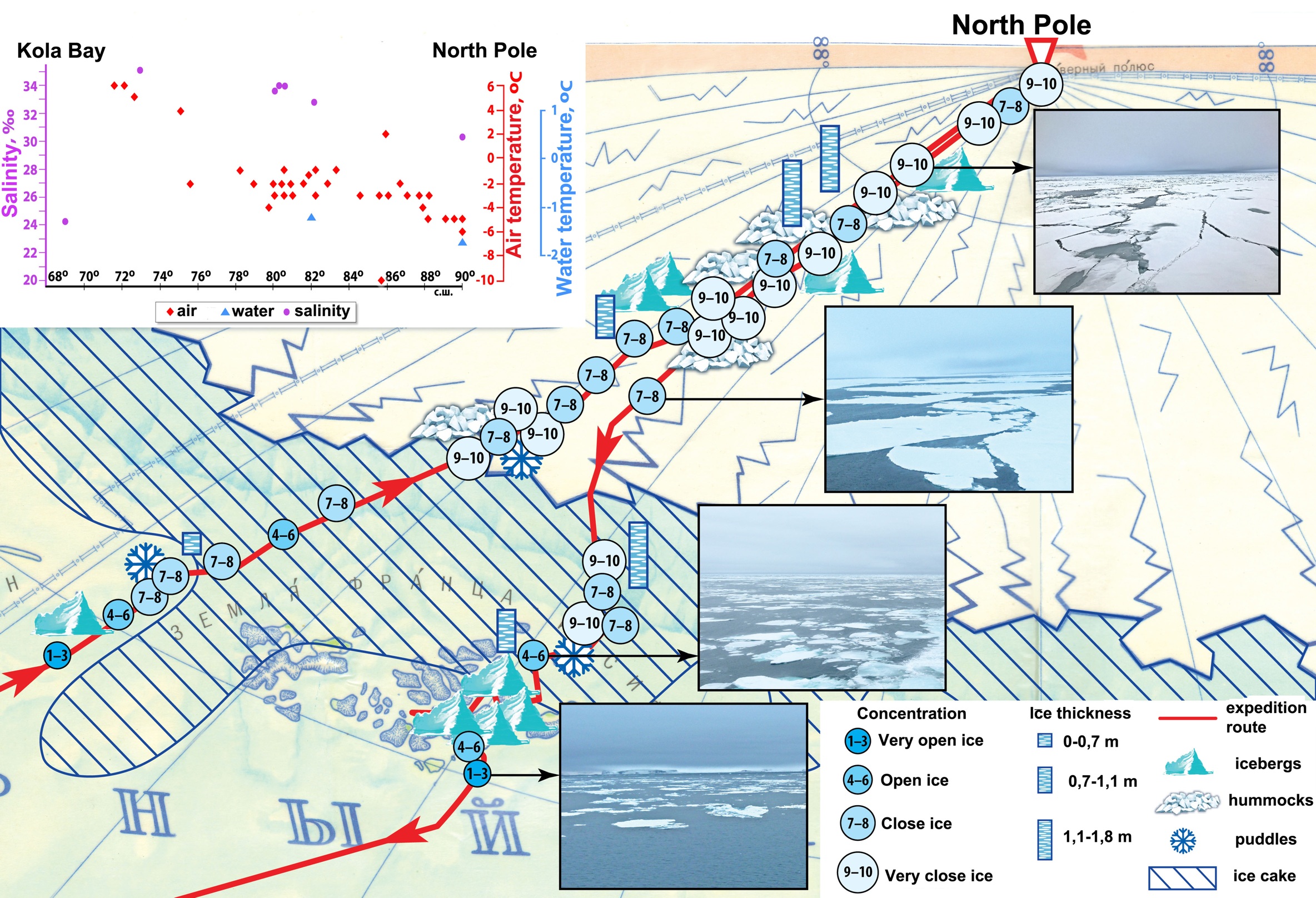 • Лёд вдоль трассы ледокола состоял главным образом из льдин двух размеров по толщине: двухметровых и полутораметровых. Первыми было занято около 50–70% видимой площади, вторыми — около 10–25%. На долю полыней и трещин приходилось порядка 10–15%.